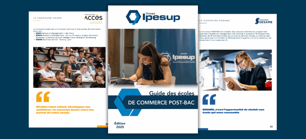 Vous êtes en Terminale et vous envisagez d’intégrer une école de commerce post-bac ? Deux concours majeurs s’offrent à vous : le concours ACCÈS et le concours SESAME. Pour vous accompagner dans cette étape décisive, Ipesup a conçu un Guide des Écoles de Commerce Post-Bac complet, pratique et stratégique.