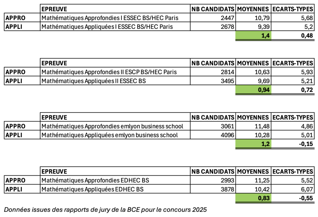 Le programme de Maths Approfondies étant plus vaste que celui des Maths Appliquées, il est légitime que les élèves ayant suivi cette spécialité obtiennent de meilleures notes, en moyenne, au concours. Ci-dessous une analyse comparative des différentes épreuves dans les deux spécialités afin de rendre compte des différences de notation.